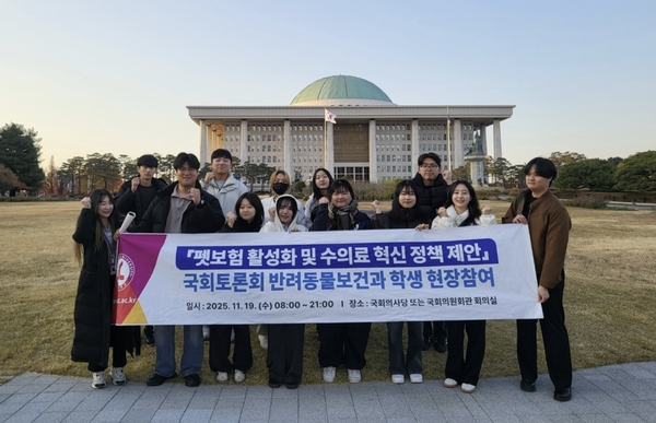 이번 현장 학습은 지난 19일 국회에서 진행됐다. 반려동물보건과 재학생과 지도교수 등 15명은 수의학계와 보험업계 전문가들이 펼친 발제와 토론을 경청하며 펫보험 제도와 수의료 정책의 흐름을 가까이에서 접했다. 반려동물 산업의 핵심 이슈가 어떻게 논의되고 제도화되는지 확인한 경험은 학생들에게 정책적 시야와 직무 감각을 키우는 계기가 됐다.