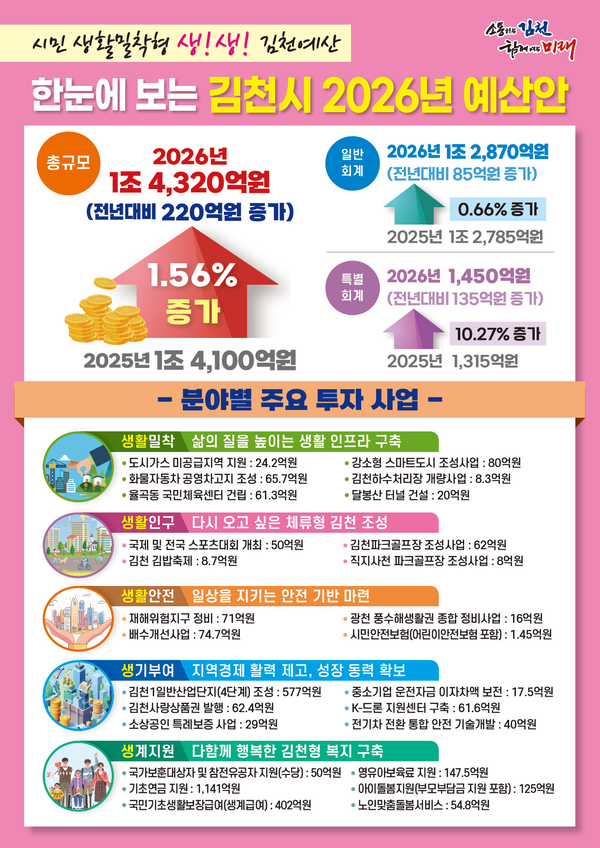 김천형 복지 구축을 위해 △국가보훈대상자 및 참전유공자 수당 지원 50억 △기초연금지원 1141억 △생계급여 402억 △영유아보육료 지원 147억5000만원 △아이 돌봄지원 125억원 등을 집중 편성했다.