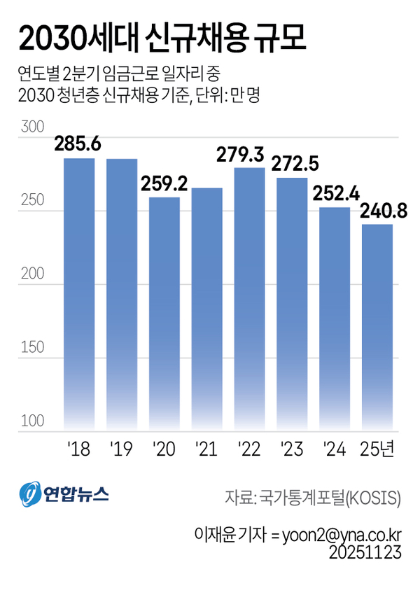 2030세대 신규채용 규모는 2022년 279만3000개, 2023년 272만5000개, 지난해 252만4000개로 계속 감소해 왔다.