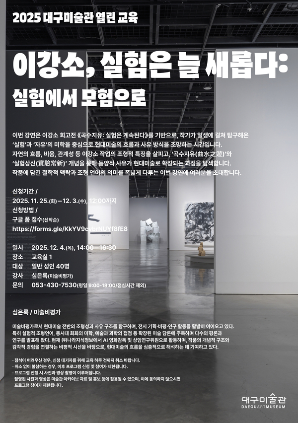 이번 프로그램은 이강소 회고전 곡수지유: 실험은 계속된다와 연계한 강연으로 작가가 수십 년간 구축해 온 실험적 조형 언어와 사유 구조를 ‘곡수지유(曲水之遊)’와 ‘실험상신(實驗常新)’ 개념을 중심으로 살펴본다.
