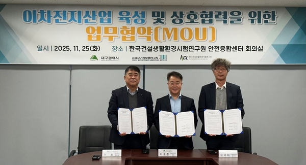 이호준 대구시 에너지산업과장은 “이번 협약은 대구가 이차전지 소재산업의 핵심 거점으로 도약하기 위한 중요한 발판”이라며 “3개 기관이 보유한 연구개발 역량과 시험·인증 인프라를 결합해 이차전지 산업생태계 조성에 최선을 다하겠다”고 말했다.