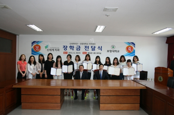 포항대학교(총장 정기영)는 지난 25일 신세계치과(대표원장 이재윤)와 장학금 전달식을 가졌다고 27일 밝혔다. 이날 신세계 치과는 전공학문에 정진하고 학과활동에 성실한 치위생과 재학생 10여명에게 총 1천 만 원의 장학금과 장학증서를 전달했다.