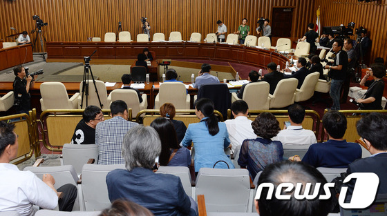 세월호 참사 유가족들(앞쪽 뒷모습)이 2일 오후 서울 여의도 국회에서 열린 세월호 침몰사고 진상규명을 위한 국정조사 특별위원회 해양경찰청 기관보고 속개를 기다리며 여당 의원들의 빈 자리(맞은편 벽쪽)를 보고 있다. 세월호 국정특위 여당 의원들은 이날 오전에 김광진 새정치민주연합 의원이 청와대와 해경 상황실 간의 녹취록을 근거로 "VIP가 원한다는 이유로 구조작업이 한창인 해경에게 영상중계 배를 가까이 될 것을 지속적으로 요구했다"고 발언 한 것과 관련해, 녹취록에는 "VIP도 그건데요, 지금"이라고만 나와 있다며, 김 의원이 의도적으로 날조, 발표했다고 주장하고, 특위 의원직에서 물러날때까지 해경 기관보고를 잠정 중단한다고 밝혔다.