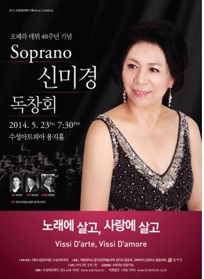 소프라노 신미경은 계명대학교 음악대학 및 한양대학교 대학원을 졸업했고, 오페라의 본고장 로마에서 공부를 마친 뒤 국내·외에서 10여회의 독창회와 수백 회의 초청연주를 통하여 탄탄한 연주 실력을 인정받고 있는 중견 성악가이다. 또한 1974년 대학교 3학년이던 시절 계명대학교가 주최한 오페라 <마르타>의 여주인공 마르타(하리엣) 역을 맡으며 오페라 무대에 데뷔했고, 올해로 데뷔 40주년을 맞는다. 독창회의 부제는 ‘노래에 살고, 사랑에 살고(Vissi d'arte, vissi d'amor)’ 인데 푸치니의 오페라 <토스카>에 수록된 아리아로 신미경의 애창곡 중 하나이다.