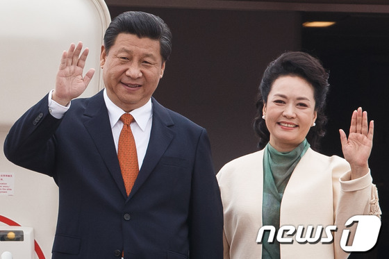 ▲시진핑(習近平) 중국 국가주석이 부인 펑리위안(彭麗媛) 여사와 함께 3일 경기도 성남 서울공항에 도착해 손을 흔들고 있다. 시 주석은 이날 오후 청와대에서 박근혜 대통령과 한·중 정상회담을 한 뒤 공동 기자회견을 열어 회담 결과를 설명할 예정이다.