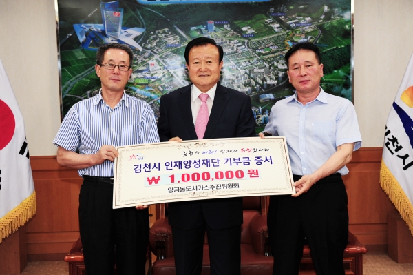 김천의 교육발전과 글로벌 인재육성을 위해 양금동 도시가스공급 추진위원회(위원장 박재기)에서 김천시인재양성재단(이사장 박보생)에 장학기금 100만원을 기탁했다.