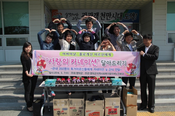 이날 행사는 영덕지역자활센터 등 재가노인복지 관련 기관 8곳과 연계해 소외된 독거 어르신 가정을 방문하여, 자녀를 대신해서 어르신에게 어버이날의 감사 마음을 전하는 등 어르신을 위로하며 따뜻한 정을 나누는 시간을 갖고자 마련했다.