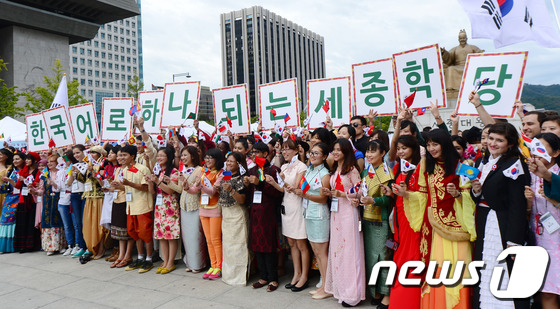 ▲(사진설명) 서울 광화문 세종대왕 동상 앞에서 세종학당 외국인 학습자들이 전통의상을 입고 자국기와 태극기를 흔들며 한국어 사랑을 표현하는 플래시몹을 펼치고 있다. |