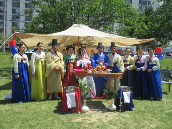 지난 3일 오전11시 성주군 성밖숲에서는 생활사(生活死)를 주제로 기획된 2014 성주생명문화축제의 활(活)부문 프로그램인 전통혼례가 지난해에 이어 열렸다. 이번 혼례는 세월호참사로 2014 성주생명문화축제가 취소돼 다소 아쉬운 점은 있었지만 실제 다문화가족이 올리는 인륜지대사인 만큼 풍물패 교의 꽃가마 등은 생략하고 진행됐다. 이날 혼례의 주인공은 신랑 도성회(41) 신부 쑨슈펀(35, 중국 출신) 부부로 2012년 9월에 만나 백년가약 부부의 연을 맺었고 올해는 사랑스러운 딸도 태어나 행복한 가정을 꾸리고 있다. 안동예절학교 진행으로 치러진 이번 혼례는 전안례 교배례 서천지례 서배우례 합근례 순으로 정중하게 진행되었으며 가족 친인척 친구 등 200여명의 하객들이 참석해 축하했다. 혼례를 마친 도성회씨 부부는 “축제가 취소된 것은 아쉽지만 오늘 이렇게 평생 기억에 남을 특별한 결혼식을 할 수 있어서 매우 행복하고, 참석해 주신 모든 분들께 감사드리며, 앞으로 서로 합심해서 잘 살겠다”고 말했다. 박석규 기자