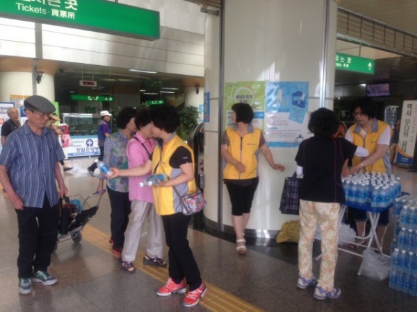 지난 11일부터 매일 오후 2시에서 4시 사이에 진행하고 있는 이번 봉사활동에는 자원봉사자 10여명이 참여해 시원한 병입 수돗물 500병을 나눠주고 있다,
