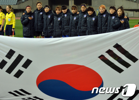 29일 일본 오사카 얀마스타디움에서 열린 2016 브라질 리우올림픽 여자축구 아시아지역 최종예선전 대한민국과 북한의 경기에서 대한민국 선수들이 국민의례를 하고 있다. 2016.2.29/뉴스1 © News1 김명섭 기자 |