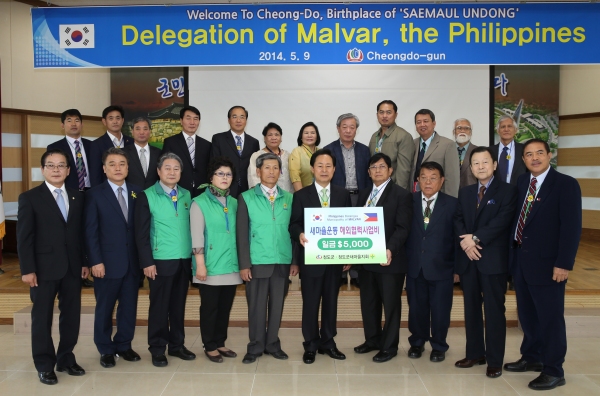필리핀 마닐라 남부지방에 위치한 바탕가스주 말바르시(MUNICIPALITY OF MALVAR) 레이예스 시장 일행이 지난 9일 청도군을 방문했다. 이번 방문은, 2013년도 7월 청도군에서 필리핀을 방문하여 새마을운동을 전파하고, 말바르시와 공동추진하기로 한 새마을운동 해외협력사업의 세부사항 논의 및 상호교류 증진과 청도군의 새마을운동 성공경험을 배우는데 목적을 두었다. 이날, 군청 대회의실에서 열린 방문행사에서 청도군의 필리핀 현지 글로벌 새마을해외협력사업의 추진을 위한 카카오 묘목재배(농가소득증대사업) 사업비 전달식을 가졌다. 또한, 시장 일행은 청도읍 신도리에 위치한 새마을운동발상지기념관을 방문하는 한편, 지역내 버섯공장인 대흥농산, 한재미나리 단지, 농기계임대사업소, 소싸움장, 와인터널을 견학했다. 박중양기자