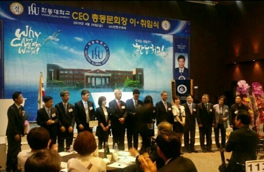 ▲한동대학교 최고경영자과정 총동문회는 지난달 29일 UA컨벤션에서 회장 이·취임식을 열었다.