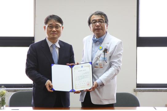 ▲포항선린병원 서병호 병원장(우)과 대구가톨릭대학교의료원 이동국 병원장(좌)이 협력병원 협약체결 후 기념촬영을 하고 있다.