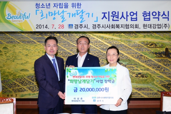 28일 경주시는 지역 저소득 청소년들의 자립 의지에 날개를 달아 주기위한 ‘희망날개달기지원사업’ 협약서 체결과 더불어 장학금 전달식을 대외협력실에서 최양식 경주시장, 경주시사회복지협의회 회장 송미호, 현대강업(주) 이상춘 대표가 참석한 가운데 개최했다.