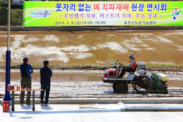 울진군농업기술센터(소장 신규환)는 9일 오후 2시 원남면 매화리 기미독립만세공원 앞들에서 직파 재배 및 선도 농업인 50여명이 참여한 가운데 쌀 생산비 및 노동력 절감을 위한‘못자리 없는 벼 직파재배 연시회’를 열었다. 장부중 기자
