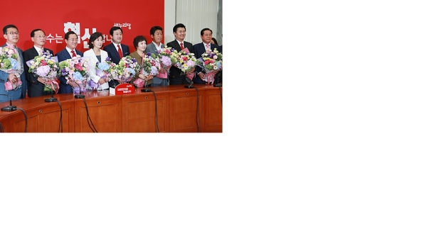 ▲새누리당은 31일 최고위원회의에서 전날 재보궐 선거에 당선된 11명 가운데 9명의 당선자가 참석해 지도부로부터 꽃다발을 받고 축하의 인사를 건넸다. |
