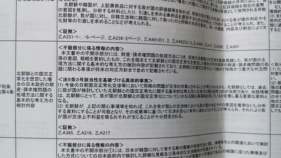 "이것을 근거로 북조선과의 국교정상화를 상정한 경우 일본 정부의 재산·청구권 문제의 처리방법에 관한 기본적인 사고방식의 검토내용이 기재돼 있어 북조선과의 국교정상화라고 하는 매우 특수하고 중대한 외교문제에 관한 사항이 장래의 대응방침까지 포함해서 기재돼 있어 공개가 어렵다"는 것이다.
