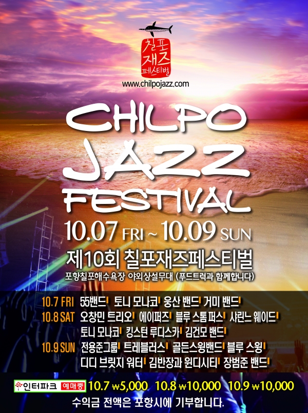 한편 2016 칠포재즈페스티벌 티켓은 인터파크 티켓 페이지에서 10월 7일자는 5천원, 8·9일자는 각각 1만원에 판매하고 있다. 이 행사의 수익금은 어려운 이웃을 돕기 위해 포항시에 전액 기부된다.