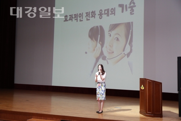 이날 가톨릭대 평생교육원 스피치학과 이지숙 교수를 초청해 전화 응대의 기본자세, 메모하는 방법, 공감·인정·청유형·쿠션·앵무새 화법 등 12가지 대화 기술, 상황별 적절한 대처방법 등 민원인 입장에서 이해하고 원활한 소통을 위한 다양한 기법 등을 교육했다.