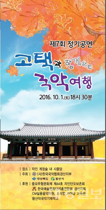한편 국악협회 경산지부는 ‘고택과 함께하는 국악여행’외 ‘자인 단오제 축하공연’, ‘아시아의 음악여행’ 등을 기획, 공연함으로써 시대의 흐름에 맞는 여러 장르의 음악을 포용하고 우리 전통음악의 본질을 지킴과 동시에 우리 전통 음악을 알리는데 앞장서고 있다.