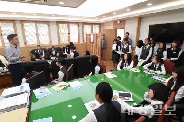 지난 5일 영덕군청 군수 직무실을 방문한 학생들이 이희진 군수로부터 공무원과 군 정에 대한 설명을 득고있는 모습
