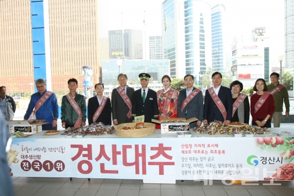 지난달 29~30일 양일간 서울역 맞이방에서 16개 지방자치단체가 참여한 홍보행사에 이어 단독 나눔행사를 실시한 시는 이강연 경산시농업기술센터소장을 비롯한 조한걸 농협중앙회 경산시지부장, 최병영 재경향우회장을 비롯한 여러 향우회원과 대추아가씨 등 관계자 20여명이 참석한 가운데 최고의 품질 생대추(사과대추, 복조)만을 엄선해 무료 나눔행사를 펼쳤다.