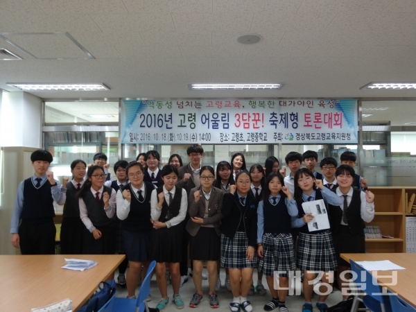 중, 고 학생들이 당일 추첨으로 팀을 만들어 학교 별 경쟁이 아닌 상대방에 대한 배려와 존중 속에서 토론을 즐기는 축제 형으로 진행 대회 결과 고령고 2학년 김지현, 고령중 3학년 최선희, 다산중 3학년 이해인 세 명의 학생으로 구성된 ‘토론의 신’팀이 1위인 3담상을 차지했다.