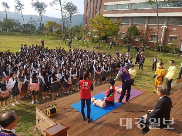 또한 이 날 영천시는 선화여자고등학교(교장 이희명)에서 학생 및 교직원, 소방서, 경찰서 등 450여명이 참여한 가운데 시범훈련을 실시했다. 훈련메뉴얼에 따라 진행 후 대피한 운동장에서 소방관이 국민행동요령과 심폐소생술 교육을 실시하여 전 참여자들이 보다 잘 숙지할 수 있는 기회가 되었다.