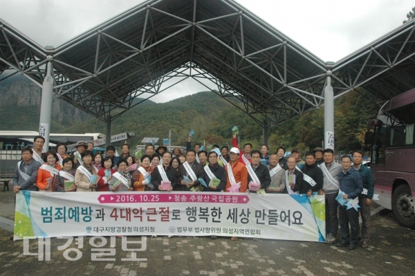 이 날 행사에는 검찰 관계자 및 법사랑위원 등 50여명이 참여하였으며, 『‘배려’ 법질서의 기본입니다. 4대악 근절로 행복세상 만들어요』 문구가 새겨진 1,000여장의 등산용 스카프 홍보물을 제작, 주왕산에 온 등반객들을 대상으로 나누어 주며 4대악(학교폭력, 가정폭력, 성폭력, 불량식품)근절 캠페인을 전개했다.
