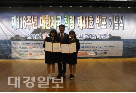 의성여자중학교 오윤진 학생과 정다연 학생이 지난 25일 국회도서관 대강당에서 열리는 제116주년 ‘대한제국 칙령 제41호’ 반포 기념식에서 국회의원상을 수상했다고 밝혔다.이번 수상은 오윤진과 정다연 학생은 독도운동사랑본부의 ‘제3기 독도사랑 SNS기자단’으로 선발되어 독도사랑 실천과 우수한 홍보 활동을 한 결과, 전국학생대표 결의문 낭독자로 선정돼 다음달 2일부터 4일까지 독도 방문 체험활동에 참여할 예정이다