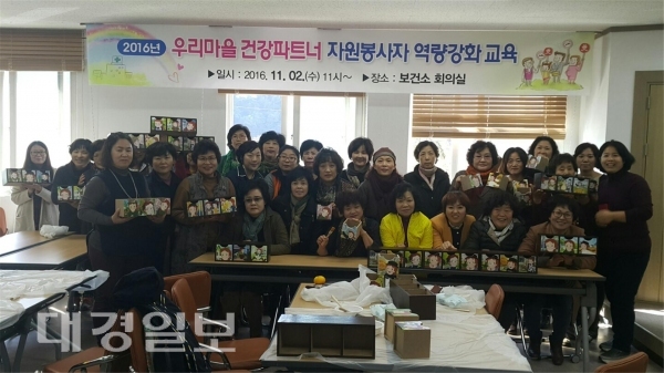 의성군보건소가 2일 우리마을 건강파트너자원봉사자 60명을 대상으로 만성질환인 고혈압, 당뇨관리 등 건강관리와 냅킨아트 공예 등 역량강화교육을 가졌다.이날 120명의 자원봉사자가 지역주민들의 건강증진을 위한 행복백세 수중운동교실, 금연홍보활동, 암 검진 홍보, 치매선별검진 ․ 치매예방쉼터 운영 도우미 등 각종 보건사업 및 캠페인 활동을 전개했다.