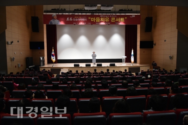 청송군은 지난 11월 15일(화) 오후 1시 청송군문화예술회관 대공연장에서 마음치유학교 교장인 혜민스님을 초청하여 “마음치유콘서트-완벽하지 않은 것들에 대한 사랑”이라는 주제로 11월 “명품 청송아카데미’를 개최했다. 베스트셀러 작가이자 대한민국 대표 힐링 멘토인 혜민스님은 현재 서울 인사동에서 마음치유학교를 건립하여 ‘마음 잇다’라는 프로그램으로 경쟁과 스트레스, 우울과 불안에 휩싸여 있는 현대 도시인들의 마음을 치유하고 있으며, 이번 강좌에서 “우리의 삶은 완벽하지 않고 문제투성이 같은 것들로 가득차 있지만 그러한 세상 속에서 나 자신과 타인을 사랑하고 수용할 줄 아는 따뜻한 마음이 필요하다”라고 강조하였으며. 강연 후반에는 혜민스님과 함께 군민 모두가 “마음치유”를 위한 명상의 시간을 가지며 스스로의 마음을 다독이는 시간을 가졌다.