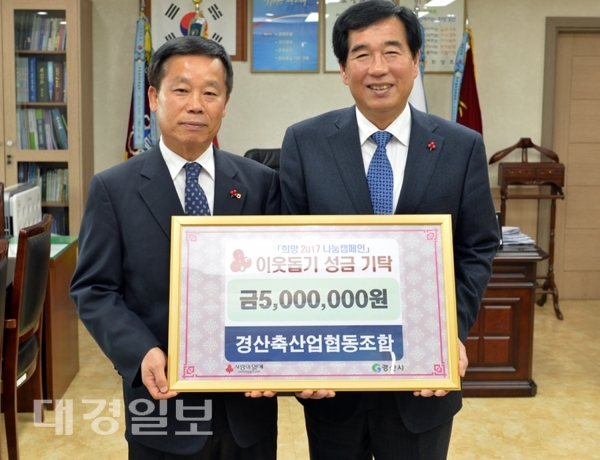 최영조 경산시장은 “우리 지역의 어려운 이웃을 위해 온정의 손길을 보내준 경산축산업협동조합 직원들에게 감사의 인사를 드리며, 이러한 나눔 실천이 지역사회 내에 확산돼 기부문화가 정착되고 사각지대해소에 밑거름이 되길 바란다”고 밝혔다.