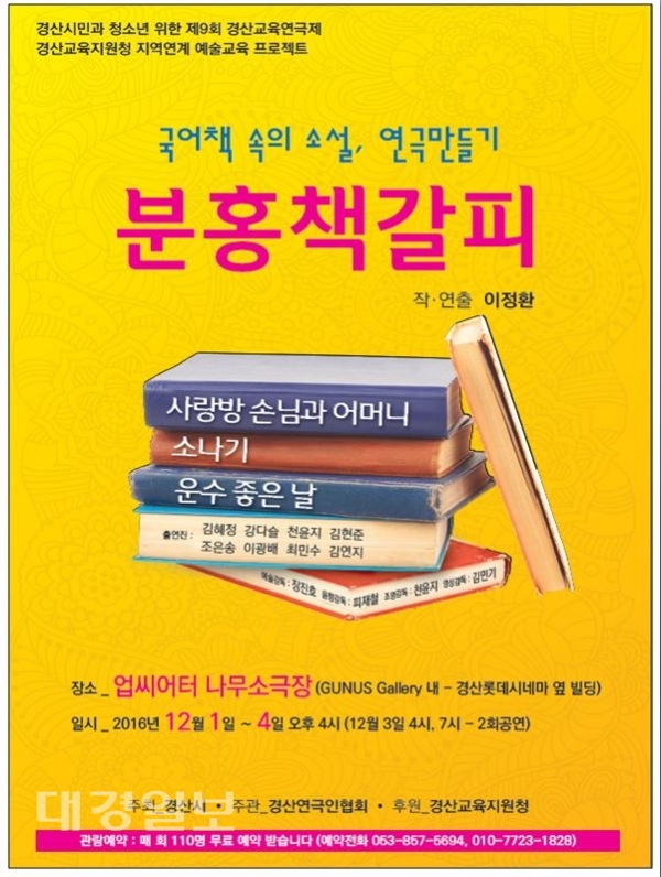 한편 업씨어터 나무소극장은 롯데시네마 옆 빌딩 3층, GUNUS Gallery 내에 있으며, 관람은 사전 무료 좌석 예약제로 예약과 문의는 전화(053-857-5694 / 010-3132-1331)로 하면 된다.