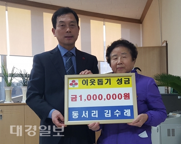 관내 아파트 청소 일을 하고 있는 김수례 할머니는 “평소에 TV프로그램 인간극장을 즐겨 보는데 어려운 환경에서도 열심히 살아가는 이웃의 얘기를 보면서 감동을 받아 힘들게 공부하는 학생들에게 조금이나마 도움을 주고 싶은 마음에 한달치 월급을 전달하게 됐다”고 말했다.