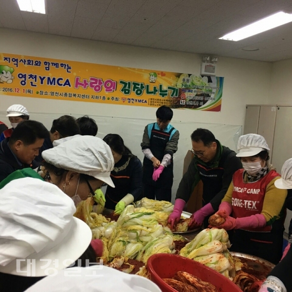 일자리경제과 직원 10명은 1일 지역자활센터 지하1층에서 영천YMCA(이사장 허의행)가 주관한 김장담그기 행사에 참여해 야사종합복지관, 지역자활센터, 노인복지센터 관계자 60여명과 함께 추운 날씨 속에서도 1,500포기(2,500kg)의 김장을 담그며 의미 있는 땀을 흘렸다. 이날 만든 김장은 독거노인, 한부모가정 등 어려운 이웃 340세대에 전달될 예정이다.