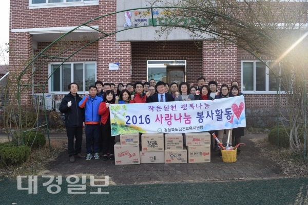 장태덕 교육장은 ‘우리의 나눔으로 아이들이 따뜻한 연말을 보낼 수 있기를 바란다.’ 고 하며, ‘앞으로도 자발적인 봉사활동을 통해 이웃사랑을 몸소 실천하도록 노력하는 김천 교육인이 되자.’ 고 말했다.