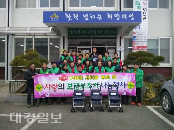 이날 구천면 청산1리 김귀연 할머니 외 23명에게 보행보조기 24개를 직접 전달하고 올해 새마을회 결산 및 2017년 새마을회 추진방향 등 총회를 부녀회 및 지도자 48명이 가졌다.