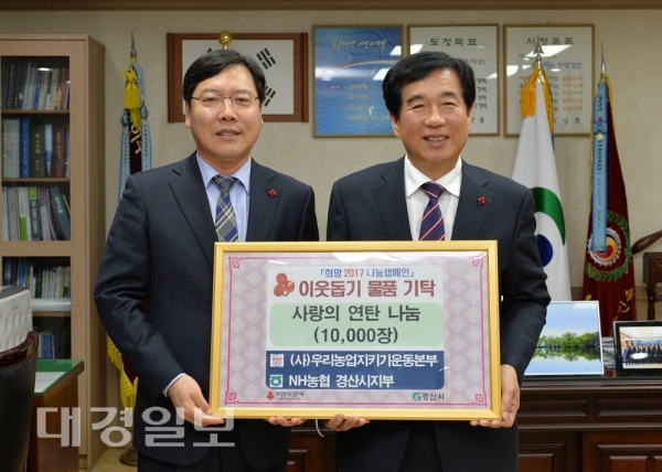 최영조 경산시장은 “어려운 이웃들을 위해 지속적인 도움을 주신 (사)우리농업지키기운동본부 경북지역본부와 NH농협 경산시지부에 깊은 감사의 인사를 전하며, 앞으로도 우리시 농업 발전을 위해 많은 협조를 부탁한다”고 밝혔다.