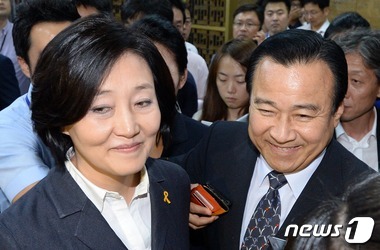 ▲7월 임시 국회 마지막 날인 19일 오후 이완구 새누리당 원내대표(오른쪽)와 박영선 새정치민주연합 원내대표가 진통을 겪고 있는 세월호 특별법과 분리 국감 실시 등 정국현안에 대한 논의를 위해 국회 귀빈식당에서 비공개 회동을 마친 뒤 미소를 지으며 공개 회견장으로 이동하고 있다. |