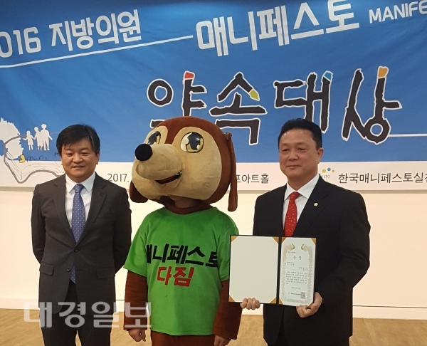 한국매니페스토 실천본부에 따르면 ‘매니페스토 약속대상’은 공약을 가장 잘 이행한 정치인들에게 주는 상으로 전국 234개 기초자치단체의 2천900여명의 의원들을 대상으로 공약이행 현황(70점)과 주민소통 활동(30점)을 평가지표로 심사해 기초의원 공약이행 분야 최우수의원으로 선정했다.
