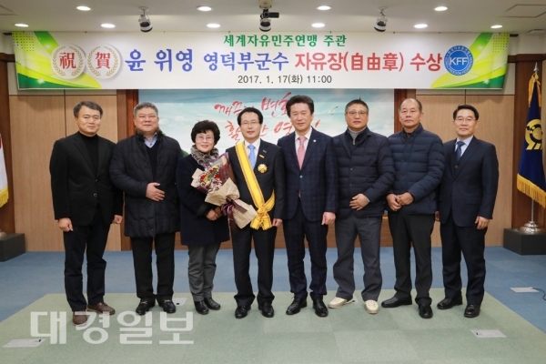 윤부군수는 수상 소감에서 “확고한 국가관으로 자유민주주의 수호와 안보의식 고취는 공직자로서 당연한 본분이며, 그동안 김화영 한국자유총연맹 경상북도회장을 비롯한 회원들의 안보지킴이 역할이 없었다면 과분한 자유장은 받을 수 없었을 것”이라며 “앞으로도 자유민주주의의 숭고한 가치에 큰틀을 두고 주민들과 함께하며 애민정신을 실천하는 노력을 게을리하지 않겠다.”고 밝혔다.