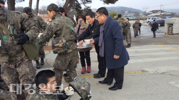 또한, 감문면방위협의회 회원들은 혹한과 싸우고 있는 군 장병들의 노고를 격려할 뿐만 아니라 내 자식이 훈련받는다는 부모의 마음으로 한명의 부상자와 낙오자 없이 훈련이 잘 마무리되길 바라면서 국방의 의무를 다하는 군 장병들에게 감사의 마음을 담아 이와 같은 행사를 준비했다.